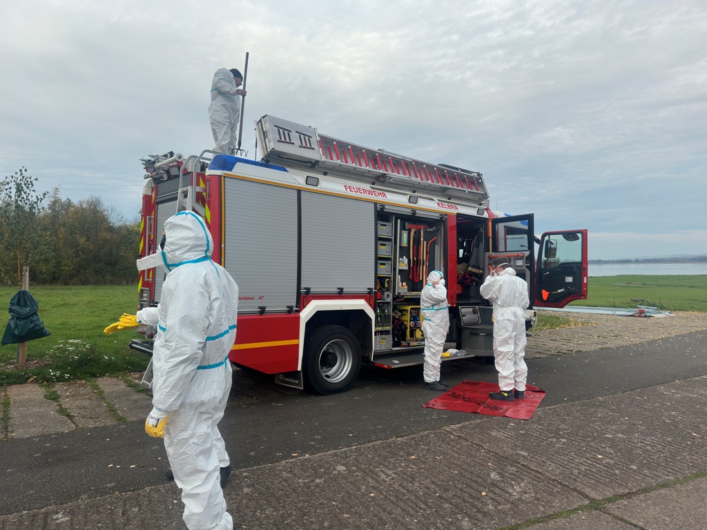 20.10.2025: Nach vorheriger Abstimmung zwischen Gemeindewehrleiter und Veterinäramt unterstützten ab 08:45 Uhr Kameradinnen und Kameraden beim Einsammeln von Vogelkadavern an der Talsperre Kelbra. Gemeinsam mit Veterinär- und Umweltamt des Landkreises mussten unter Vollschutz große Areale fußläufig und teils in morastigen Untergrund abgelaufen und die um die 5 Kilogramm schweren Kadaver an befahrbare Stellen gezogen werden. Im Einsatz bis ca. 14.30 Uhr waren 5 Einsaztkräfte der Feuerwehr Kelbra mit dem LF 20 KatS. (47-2025)