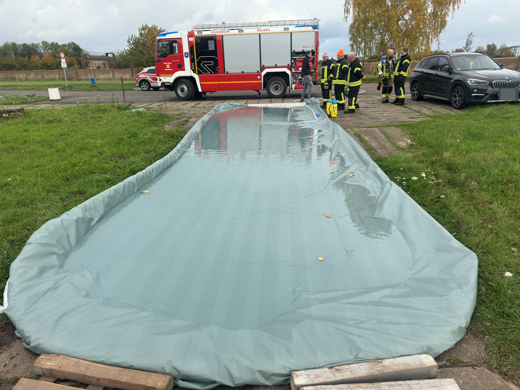 17.10.2025: Um 12.01 Uhr wurde die Feuerwehr Kelbra mit dem Stichwort "TH0 - Einrichten einer Seuchenwanne" erneut zur Talsperre Kelbra alarmiert. Auch hier erfolgte der Einsatz wieder zur Unterstützung des Kreisveterinäramtes. Aufgabe war das Errichten einer provisorischen Seuchenwanne, die durch Fahrzeuge vor Verlassen des Talsperrengeländes zu Desinfektionszwecken durchfahren werden kann. Des Weiteren wurden 2 Kameraden abgestellt um unter Vollschutz und in Wathosen die Mitarbeiter des Landkreises beim Einsammeln toter Vögel im schwer zugänglichen Uferbereich zu unterstützen. Für die Seuchenwanne wurde aus Schlauchmaterial und wasserführenden Amaturen ein Grundrahmen gebaut, der zum Ausgleich leichter Gefälle stellenweise noch mit Ölsperren erhöht wurde. Auf diesen provisorischen Rahmen wurde eine Folie ausgelegt und das entstandene Becken mit Wasser gefüllt. Für die Ein- und Ausfahrt wurde jeweils ein Satz Schlauchbrücken verwendet.