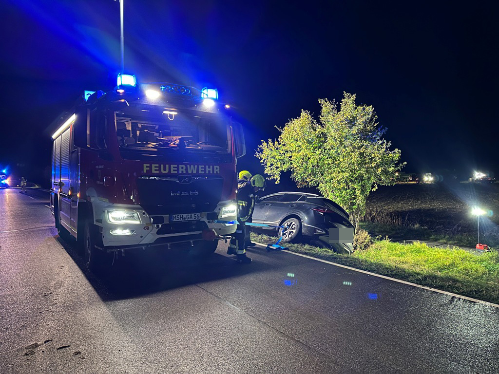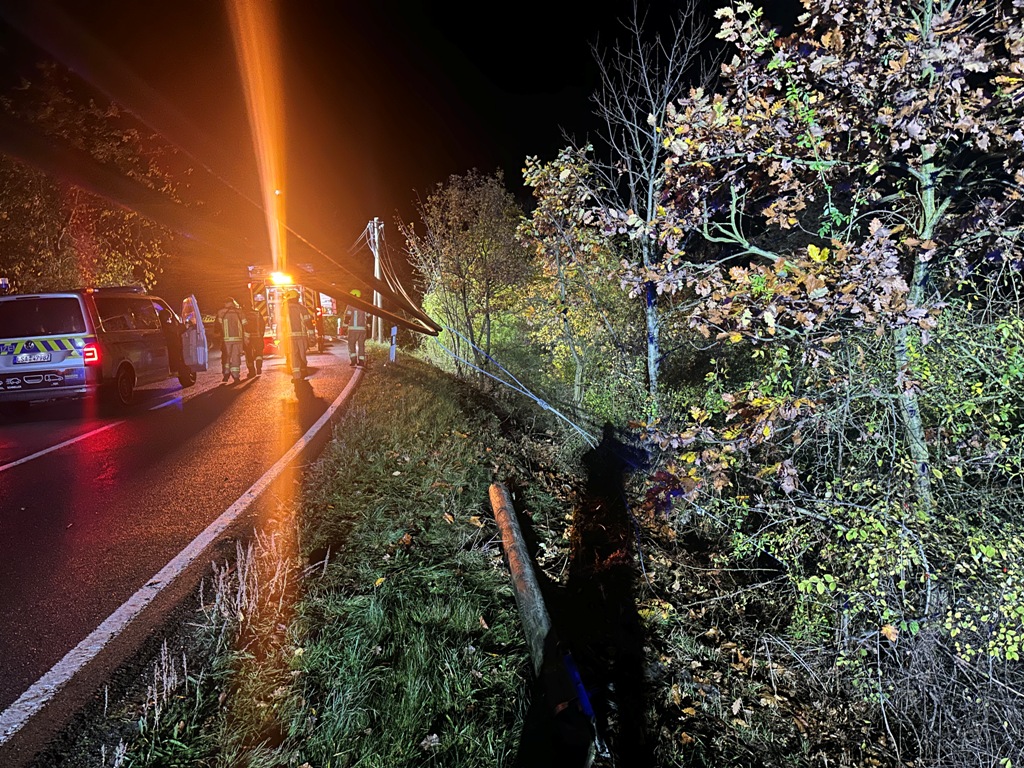 28.10.2025: Um 18.31 Uhr wurde die Feuerwehr Kelbra mit dem Stichwort "Umgestürzter Telefonmast nach Verkehrsunfall" auf die Kreisstraße 2311 in Richtung Hüfler alarmiert. Vor Ort war ein PKw aus bisher unbekannter Ursache nach rechts von der Fahrbahn abgekommen, mit einem Telefonmast kollidiert, eine ca. 5 Meter hohen Abhang hinabgestürzt und auf einem unterhalb der Straße verlaufenden Feldweg zum Stehen gekommen. Nach Aussage von Ersthelfern war der PKW mit einer Person besetzt, welche sich aber unmittelbar nach dem Unfall fußläufig und überhastet vom Unfallort entfernte. Mit Eintreffen der Feuerwehr als erste Rettungskräfte konnte kein Unfallbeteiligter mehr angetroffen werden. Da der abgebrochene Telefonmast samt Kabel auf die Fahrbahn ragte wurde unverzüglich eine Vollsperrung der Straße eingerichtet. Das Unfallfahrzeug wurde nochmals auf Insassen und auslaufende Betriebsstoffe kontrolliert, was aber Beides verneint werden konnte. Trotzdem wurde eine 2-fache Löschbereitschaft hergestellt und die Einsatzstelle großzügig ausgeleuchtet. Noch vor Eintreffen der Polizei wurden erste Suchmaßnahmen gestartet. Hierzu wurde der unmittelbare Bereich um die Unfallstelle zu Fuß durch Kameraden mit Wärmebildkameras kontrolliert. Der Bereich des Hüflers und rund um den Campingplatz wurde mit Fahrzeugen der Feuerwehren Kelbra und Thürungen abgefahren und die umliegenden Felder wurden mit der Wärmebildkamera der Drohne abgesucht. Personen konnten nicht gefunden werden. So konnte der ebenfalls alarmierte Rettungsdienst nach kurzer Zeit die Einsatzstelle wieder verlassen. Nach Rücksprache mit der Polizei wurden die Teile des Telefonmastes aus den Kabeln ausgehangen und von der Straße entfernt. Die Kabel wurden gesichert, sodass die Straße anschließend wieder befahrbar war. Alle weiteren Maßnahmen werden durch die Polizei getroffen und die Feuerwehren konnten die Einsatzstelle verlassen. Im Einsatz für knapp 2 Stunden waren 21 Einsatzkräfte der Feuerwehren Kelbra und Thürungen mit 6 Fahrzeugen, der Rettungsdienst und die Polizei. (49-2025)