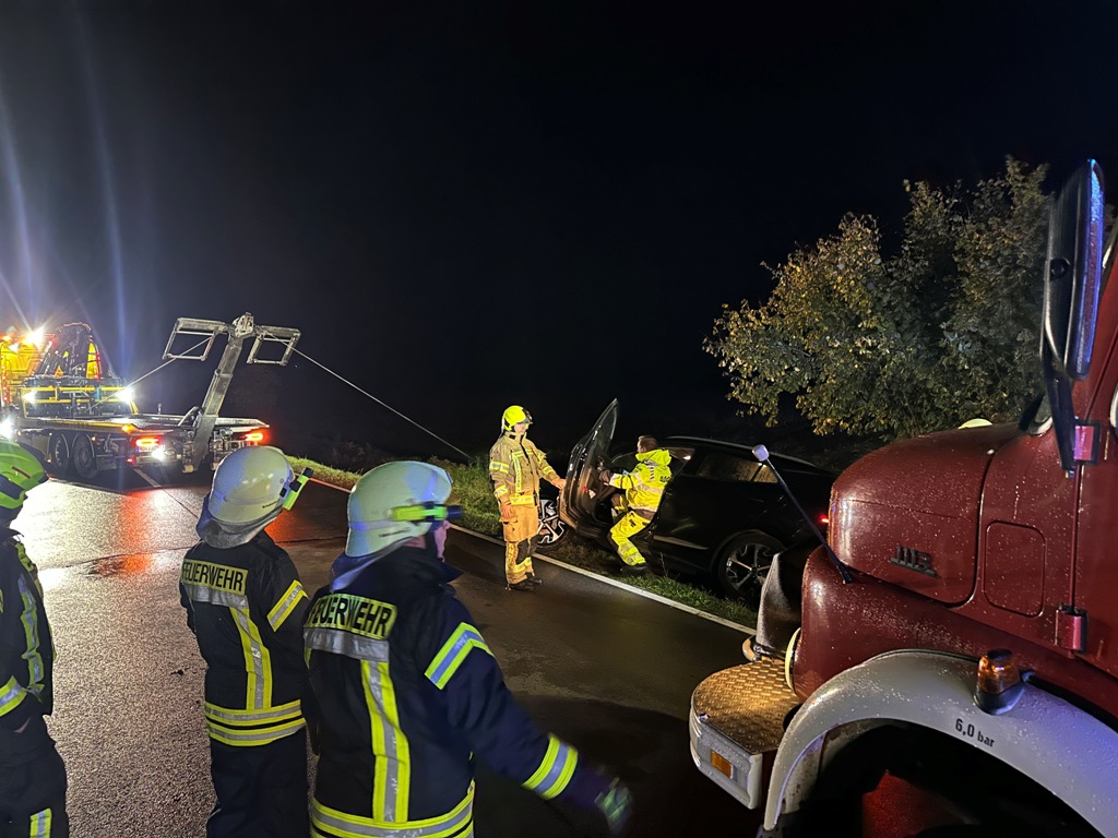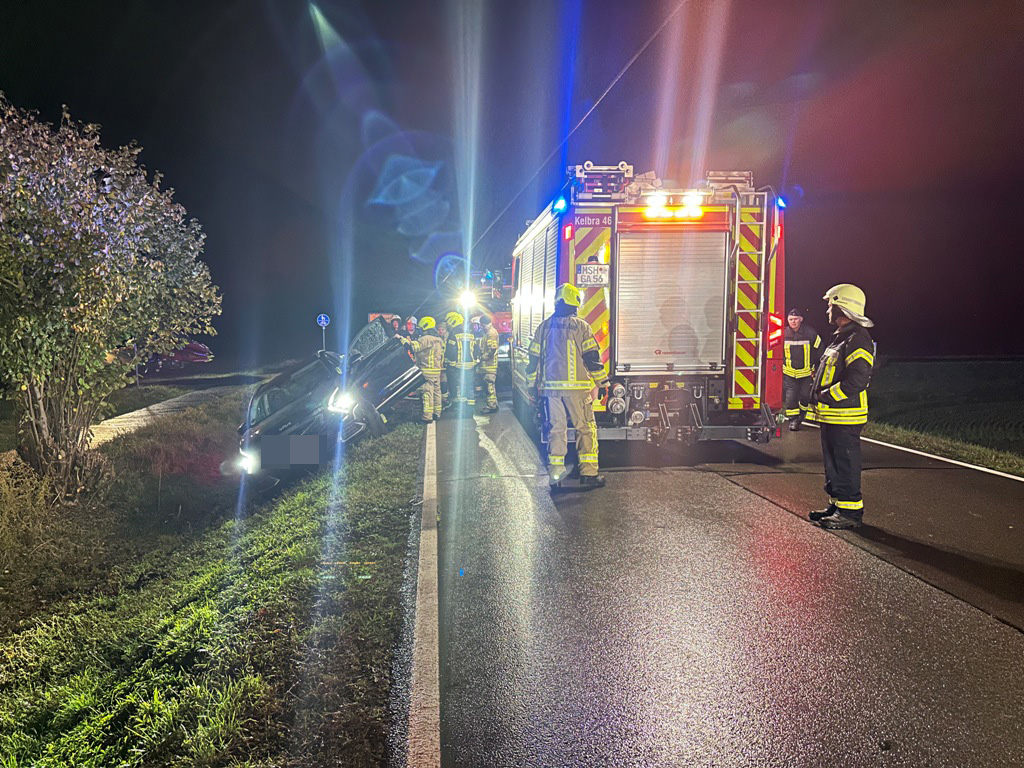 17.10.2025: Um 20.24 Uhr wurde die Feuerwehr Kelbra mit dem Stichwort "Verkehrsunfall eingeklemmte Person - PKW auf Seite droht auf Dach zu stürzen Personen im Fahrzeug" auf die Bundesstraße 85 in Richtung Thürungen alarmiert. Vor Ort zeigte sich ein PKW, der glücklicherweise noch auf den Rädern stand, sich aber in starker Schräglage im Straßengraben befand. Während 2 Personen das Fahrzeug schon verlassen hatte war der Fahrer noch im PKW, allerdings nicht eingeklemmt oder eingeschlossen. Da das Fahrzeug augenscheinlich unbeschädigt war, wurde eine Sicherung mittels Spanngurten am HLF der Feuerwehr Kelbra angeschlagen, sodass ein weiteres Abrutschen und Umkippen ausgeschlossen werden konnte. Der Fahrer konnte nun eigenständig das Fahrzeug verlassen. Nach Eintreffen des Abschleppdienstes wurde die Hinterachse des PKW durch das LF 16 der FF Thürungen und die Vorderachse mittels Seilwinde des Abschleppers gesichert, sodass das HLF umgesetzt werden konnte. Somit war Platz den PKW schonend ohne Beschädigung wieder auf die Straße zu ziehen. Der PKw war fahrbereit und konnte die Einsatzstelle eigenständig verlassen. Die Insassen wurden durch den ebenfalls alarmierten Rettungsdienst gecheckt blieben aber alle unverletzt. Im Einsatz bis kurz vor 23.00 Uhr waren 20 Einsaztkräfte der Feuerwehren Kelbra und Thürungen mit 5 Fahrzeugen, der Rettungsdienst und die Polizei. Die ebenfalls alarmierte Feuerwehr Berga konnte den Einsatz auf Anfahrt abbrechen. (46-2025)