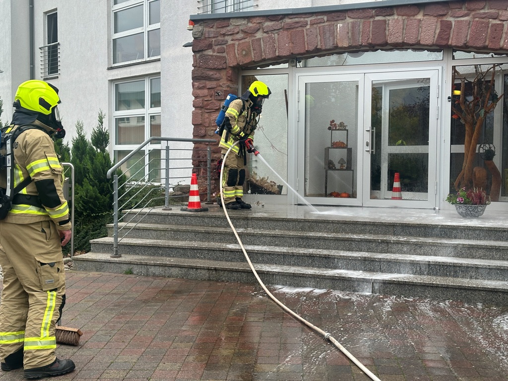 12.10.2025: Um 07.39 Uhr wurde die Feuerwehr Kelbra mit dem Stichwort "Gasgeruch" in eine Fachklinik in der Langen Straße in Kelbra alarmiert. Noch vor dem Ausrücken kam die Information durch die Rettungsleitstelle, dass es sich nicht um einen klassischen Gasaustritt handelt, sondern durch Unbekannte eine nicht genau bestimmbare Flüssigkeit vor den Haupteingängen der Klinikhäuser ausgebracht wurde. Folge war eine ätzende, stark beisende Geruchsbelästigung, die sich bereits in den Erdgeschossen zweier Klinikgebäude ausgebreitet hatte. Hierdurch erlitten insgesamt 4 Personen Beschwerden wie Kopfweh, Übelkeit und Schwindel und mussten durch den ebenfalls alarmierten Rettungsdienst ambulant behandelt werden. Die Aufstellung der Einsatzfahrzeuge erfolgte zunächst mit einem entsprechenden Sicherheitsabstand und ein erster Trupp führte eine Lageerkundung unter Atemschutz mit dem Gasmessgerät durch. Parallel dazu wurde über das Klinikpersonal eine vollständige Evakuierung der beiden Häuser veranlasst und die Eingangsbereiche gesperrt. Gemeinsam mit dem Personal der Fachklinik wurden alle über Beschwerden klagenden Personen dem Rettungsdienst zugeführt. Durch den Angriffstrupp wurde währenddessen mittels PH-Papier ein Abstrich der Flüssigkeit genommen, durch den eine leicht saure Flüssigkeit bestätigt werden konnte. Nachfolgend wurde mittels Kübelspritze eine kleine Menge Wasser auf den betroffenen Bereich aufgebracht um auszuschließen, dass eine chemische Reaktion der Flüssigkeit auf Wasser gegeben ist. Nachdem dies nicht der Fall war wurden die Eingangsbereiche beider Häuser mittels eines D-Rohres einer Grobreinigung unterzogen. Im Anschluss erfolgten intensive Belüftungsmaßnahmen mittels zweier Überdrucklüfter an beiden Häusern. Hierdurch konnte die Geruchsbelästigung deutlich reduziert werden. Nach Herstellung der Abmarschbereitschaft wurde die Einsatzstelle an den Betreiber der Klinik übergeben und der eigene Standort angefahren. Im Einsatz für gut 3 Stunden waren 22 Einsatzkräfte der Feuerwehren Kelbra und Thürungen mit 5 Fahrzeugen, der Rettungsdienst mit 2 RTW und NEF sowie die Polizei. (43-2025)