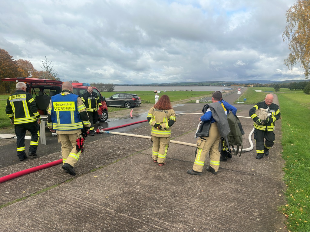 17.10.2025: Um 12.01 Uhr wurde die Feuerwehr Kelbra mit dem Stichwort "TH0 - Einrichten einer Seuchenwanne" erneut zur Talsperre Kelbra alarmiert. Auch hier erfolgte der Einsatz wieder zur Unterstützung des Kreisveterinäramtes. Aufgabe war das Errichten einer provisorischen Seuchenwanne, die durch Fahrzeuge vor Verlassen des Talsperrengeländes zu Desinfektionszwecken durchfahren werden kann. Des Weiteren wurden 2 Kameraden abgestellt um unter Vollschutz und in Wathosen die Mitarbeiter des Landkreises beim Einsammeln toter Vögel im schwer zugänglichen Uferbereich zu unterstützen. Für die Seuchenwanne wurde aus Schlauchmaterial und wasserführenden Amaturen ein Grundrahmen gebaut, der zum Ausgleich leichter Gefälle stellenweise noch mit Ölsperren erhöht wurde. Auf diesen provisorischen Rahmen wurde eine Folie ausgelegt und das entstandene Becken mit Wasser gefüllt. Für die Ein- und Ausfahrt wurde jeweils ein Satz Schlauchbrücken verwendet.