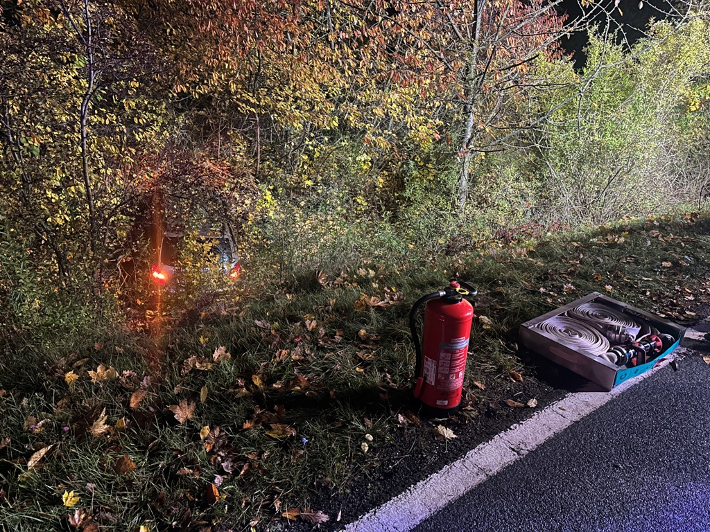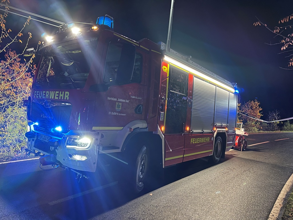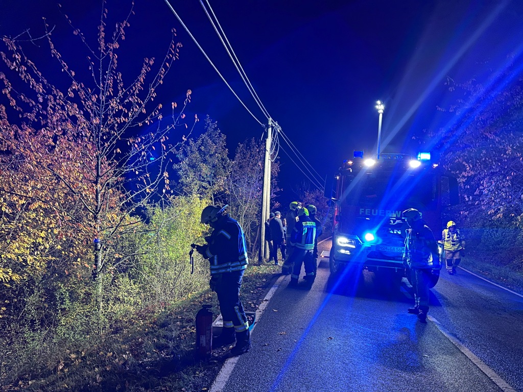 28.10.2025: Um 18.31 Uhr wurde die Feuerwehr Kelbra mit dem Stichwort "Umgestürzter Telefonmast nach Verkehrsunfall" auf die Kreisstraße 2311 in Richtung Hüfler alarmiert. Vor Ort war ein PKw aus bisher unbekannter Ursache nach rechts von der Fahrbahn abgekommen, mit einem Telefonmast kollidiert, eine ca. 5 Meter hohen Abhang hinabgestürzt und auf einem unterhalb der Straße verlaufenden Feldweg zum Stehen gekommen. Nach Aussage von Ersthelfern war der PKW mit einer Person besetzt, welche sich aber unmittelbar nach dem Unfall fußläufig und überhastet vom Unfallort entfernte. Mit Eintreffen der Feuerwehr als erste Rettungskräfte konnte kein Unfallbeteiligter mehr angetroffen werden. Da der abgebrochene Telefonmast samt Kabel auf die Fahrbahn ragte wurde unverzüglich eine Vollsperrung der Straße eingerichtet. Das Unfallfahrzeug wurde nochmals auf Insassen und auslaufende Betriebsstoffe kontrolliert, was aber Beides verneint werden konnte. Trotzdem wurde eine 2-fache Löschbereitschaft hergestellt und die Einsatzstelle großzügig ausgeleuchtet. Noch vor Eintreffen der Polizei wurden erste Suchmaßnahmen gestartet. Hierzu wurde der unmittelbare Bereich um die Unfallstelle zu Fuß durch Kameraden mit Wärmebildkameras kontrolliert. Der Bereich des Hüflers und rund um den Campingplatz wurde mit Fahrzeugen der Feuerwehren Kelbra und Thürungen abgefahren und die umliegenden Felder wurden mit der Wärmebildkamera der Drohne abgesucht. Personen konnten nicht gefunden werden. So konnte der ebenfalls alarmierte Rettungsdienst nach kurzer Zeit die Einsatzstelle wieder verlassen. Nach Rücksprache mit der Polizei wurden die Teile des Telefonmastes aus den Kabeln ausgehangen und von der Straße entfernt. Die Kabel wurden gesichert, sodass die Straße anschließend wieder befahrbar war. Alle weiteren Maßnahmen werden durch die Polizei getroffen und die Feuerwehren konnten die Einsatzstelle verlassen. Im Einsatz für knapp 2 Stunden waren 21 Einsatzkräfte der Feuerwehren Kelbra und Thürungen mit 6 Fahrzeugen, der Rettungsdienst und die Polizei. (49-2025)